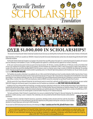 The Foundation currently provides seventy-two Endowed Scholarships. For information about contributing to the Knoxville Panther Scholarship Foundation and helping future Knoxville High School graduates, go to the Foundation website at kpsfoundation.org or contact Board President Michael Moats at kpsfoundation04@gmail.com